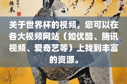 关于世界杯的视频,您可以在各大视频网站(如优酷、腾讯视频、爱奇艺等)上找到丰富的资源。