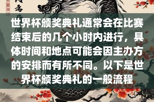 世界杯颁奖典礼通常会在比赛结束后的几个小时内进行,具体时间和地点可能会因主办方的安排而有所不同。以下是世界杯颁奖典礼的一般流程