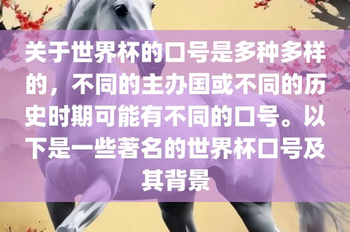 除此之外,每一届世界杯也都有自己的独特口号,旨在表达主办国对足球的热情和对世界杯的期待,这些口号不仅代表了世界杯的精神和文化内涵,也成为了世界杯历史的重要组成部分,如果您对某一届世界杯的口号有更具体的问题,欢迎继续向我提问。