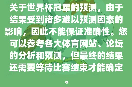 摘要:关于世界杯冠军的预测存在不确定性,因为结果受到许多难以预测的因素影响。可以参考体育网站和论坛的分析和预测,但最终结果需等待比赛结束才能确定。任何预测都只是参考,实际结果可能会有所不同。