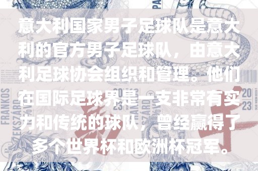 意大利国家男子足球队是意大利的官方男子足球队,由意大利足球协会组织和管理。他们在国际足球界是一支非常有实力和传统的球队,曾经赢得了多个世界杯和欧洲杯冠军。