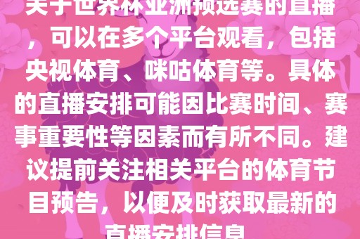 信息仅供参考,建议访问相关论坛或咨询专业人士,获取更多关于世界杯亚洲预选赛直播的信息。