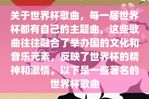关于世界杯歌曲,每一届世界杯都有自己的主题曲,这些歌曲往往融合了举办国的文化和音乐元素,反映了世界杯的精神和激情。以下是一些著名的世界杯歌曲