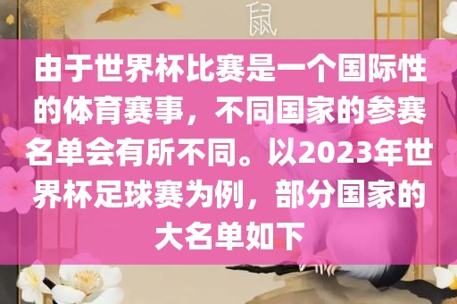 由于世界杯比赛是一个国际性的体育赛事,不同国家的参赛名单会有所不同。以2023年世界杯足球赛为例,部分国家的大名单如下