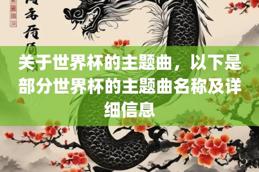 摘要:,,本文介绍了世界杯的部分主题曲名称及详细信息。这些主题曲是世界杯的重要组成部分,为比赛增添了激情和氛围。每首歌曲都有其独特的风格和旋律,反映了世界杯的精神和氛围。通过本文,读者可以了解世界杯主题曲的历史和相关信息。