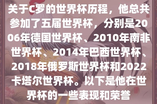 关于C罗的世界杯历程,他总共参加了五届世界杯,分别是2006年德国世界杯、2010年南非世界杯、2014年巴西世界杯、2018年俄罗斯世界杯和2022卡塔尔世界杯。以下是他在世界杯的一些表现和荣誉