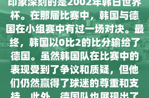 韩国和德国在世界杯足球赛中有过多次交锋。其中,最令人印象深刻的是2002年韩日世界杯。在那届比赛中,韩国与德国在小组赛中有过一场对决。最终,韩国以0比2的比分输给了德国。虽然韩国队在比赛中的表现受到了争议和质疑,但他们仍然赢得了球迷的尊重和支持。此外,德国队也展现出了强大的实力和战术素养,赢得了球迷们的赞赏。