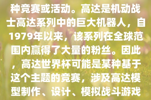 为了获取关于“高达世界杯”更具体的信息,您可以尝试在社交媒体平台上搜索相关话题,或者查看与高达相关的官方网站和论坛,不过截至当前时间,我并没有具体关于“高达世界杯”的详细信息,如果您想了解具体的活动情况,建议访问相关社区获取最新和详细的信息。