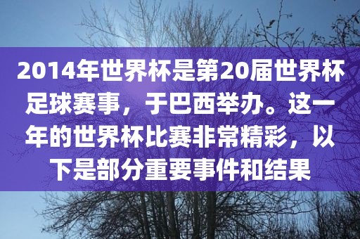 2014年世界杯是第20届世界杯足球赛事,于巴西举办。这一年的世界杯比赛非常精彩,以下是部分重要事件和结果