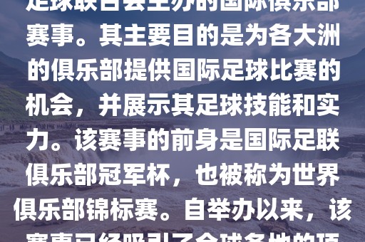 国际足联俱乐部世界杯是一项由国际足球联合会主办的国际俱乐部赛事,旨在为全球各大洲的俱乐部提供国际比赛机会并展示其实力。该赛事前身是世界俱乐部锦标赛,自举办以来吸引了全球顶级俱乐部参与。获得该赛事冠军是全球俱乐部足球的最高荣誉之一。
