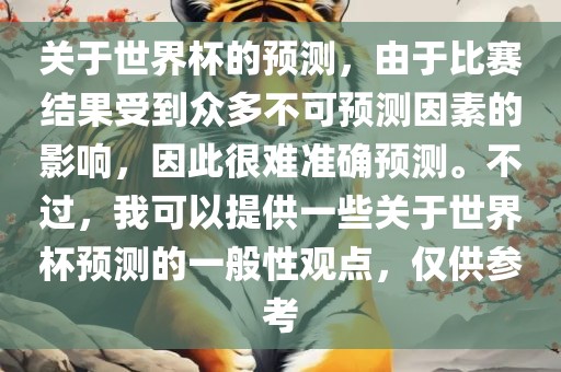 关于世界杯的预测,由于比赛结果受到众多不可预测因素的影响,因此很难准确预测。不过,我可以提供一些关于世界杯预测的一般性观点,仅供参考