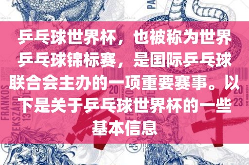 乒乓球世界杯,也被称为世界乒乓球锦标赛,是国际乒乓球联合会主办的一项重要赛事。以下是关于乒乓球世界杯的一些基本信息